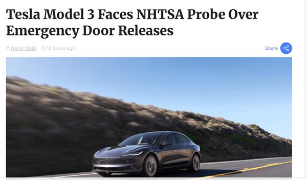 又是荫藏式门把手惹的祸。 特斯拉又被监管部门查了,好意思国国度公路交通安全照拂局(NHTSA),负责启动了针对特斯拉 Model 3 的劣势探望,原因是车辆救急 ...