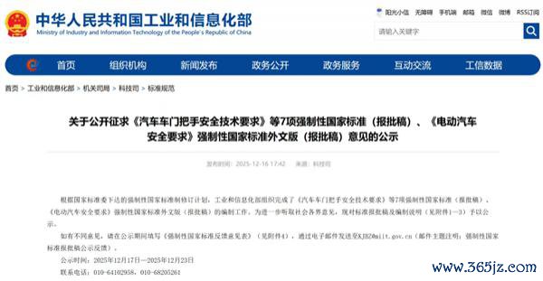 12 月 18 日,工业和信息化部负责发布对于公开征求《汽车车门把手安全本事条件》等 7 项强制性国度法度(报批稿)、《电动汽车安全条件》强制性国度法度外文版(报批稿)主意的公示。